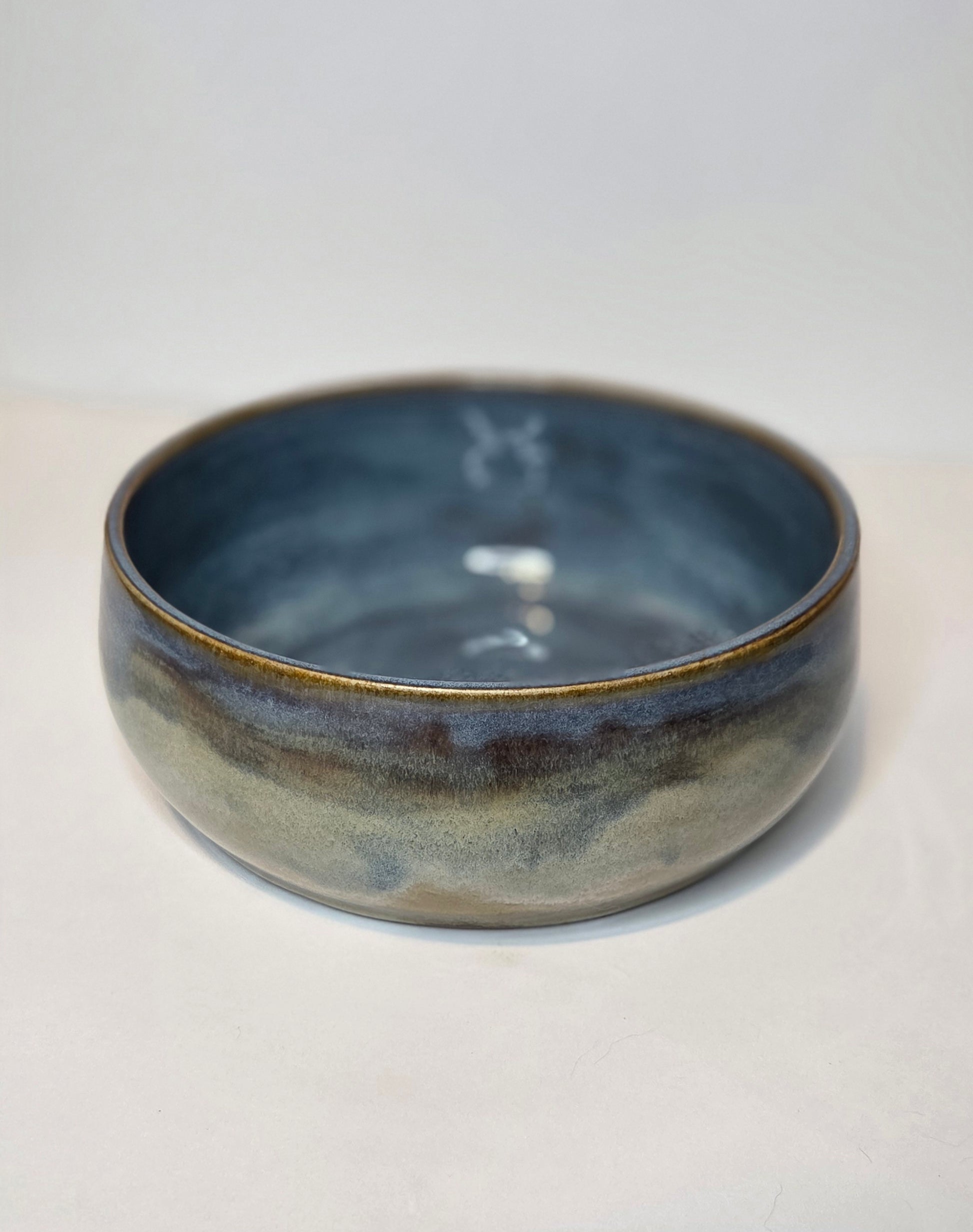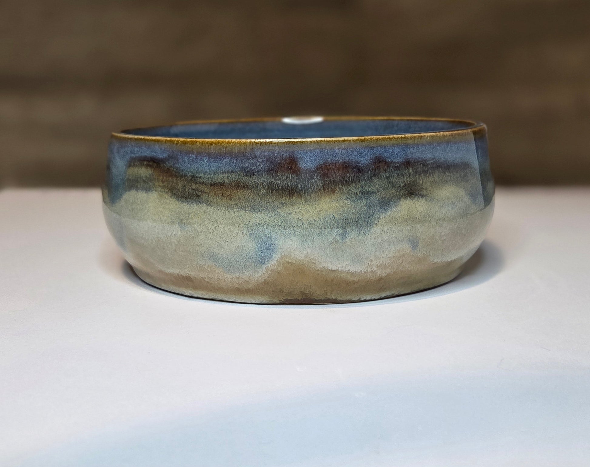 Serving dish perfect for rolls or chips! Glazed in blue and brown hues. Measures approximately 7" x 3" tall.