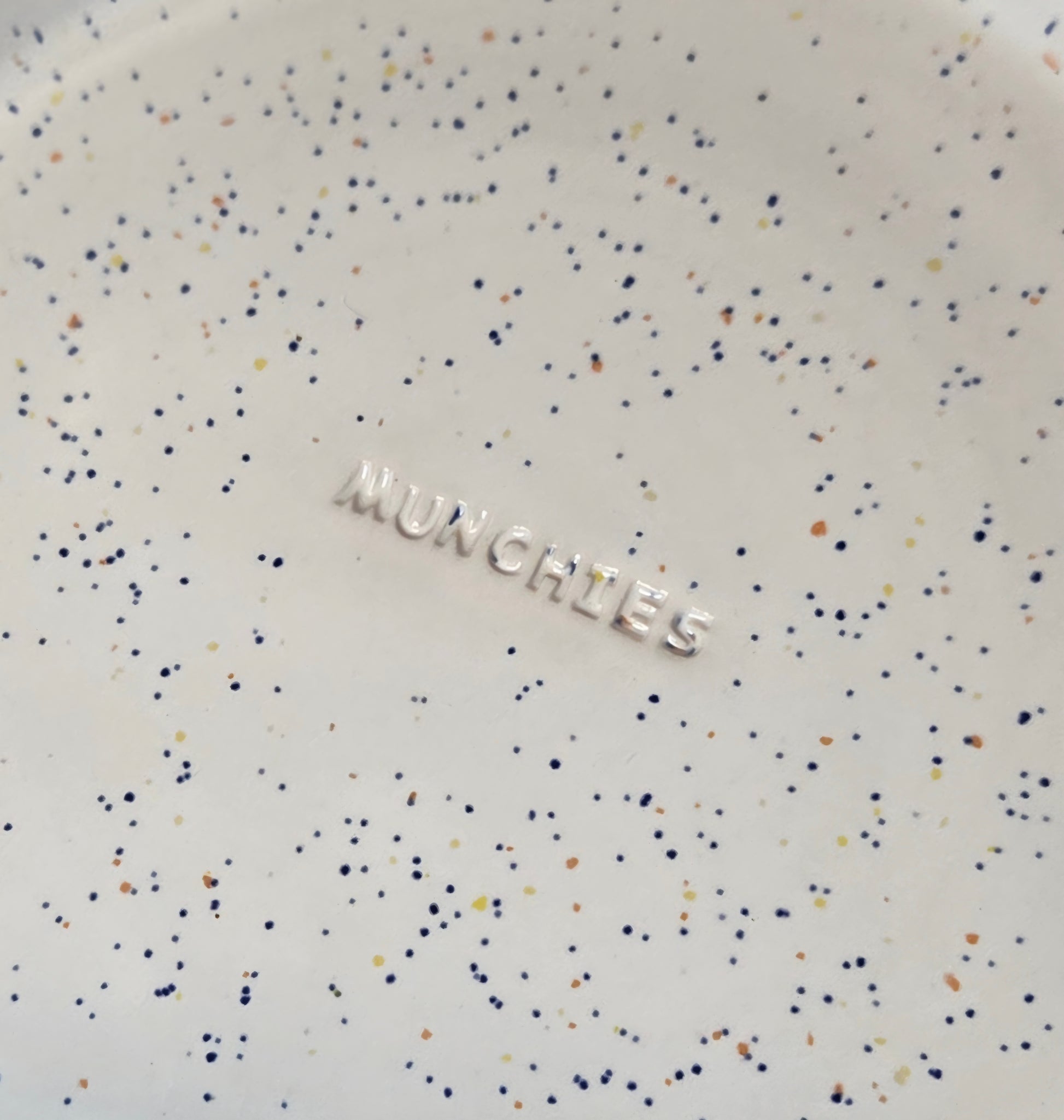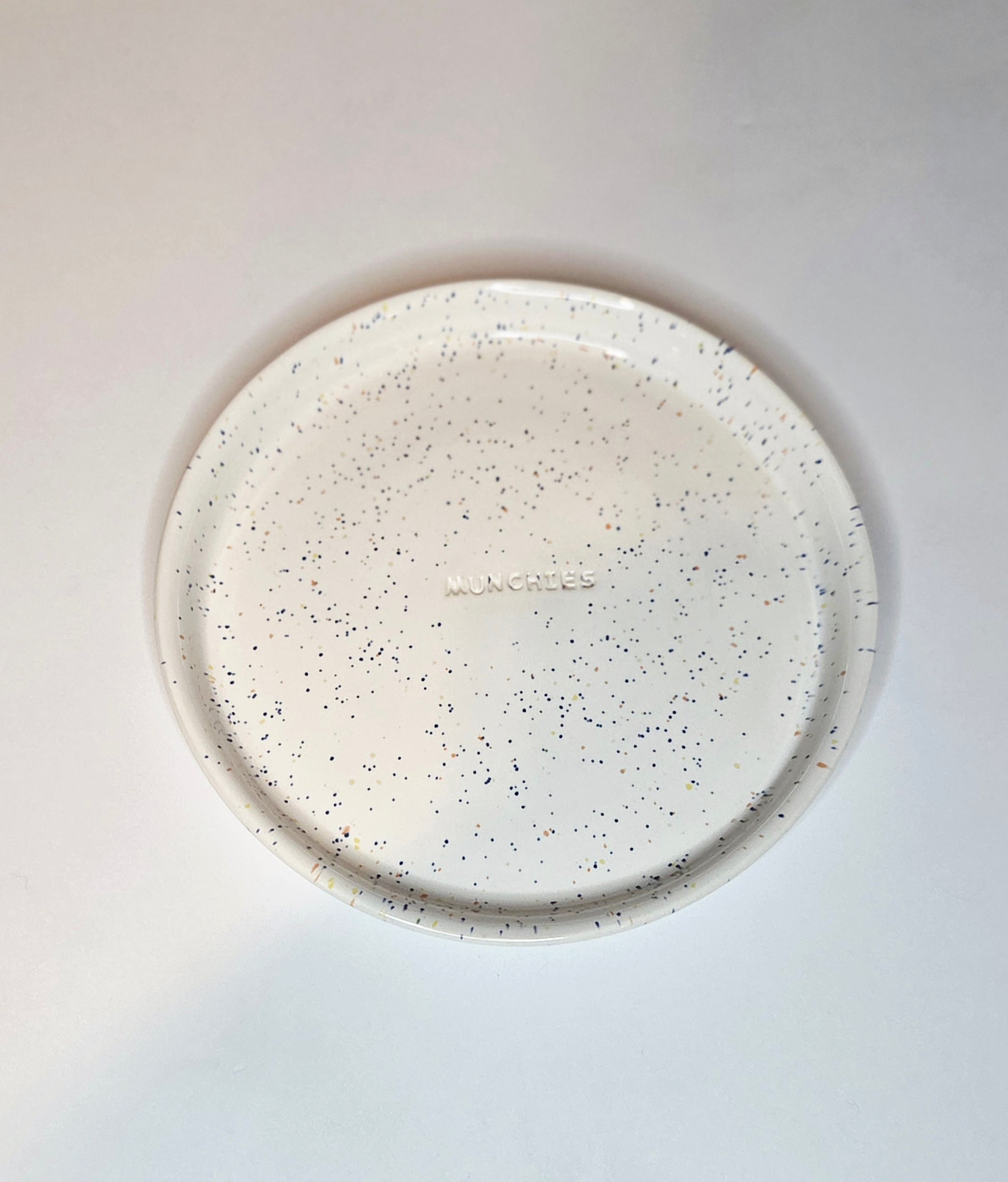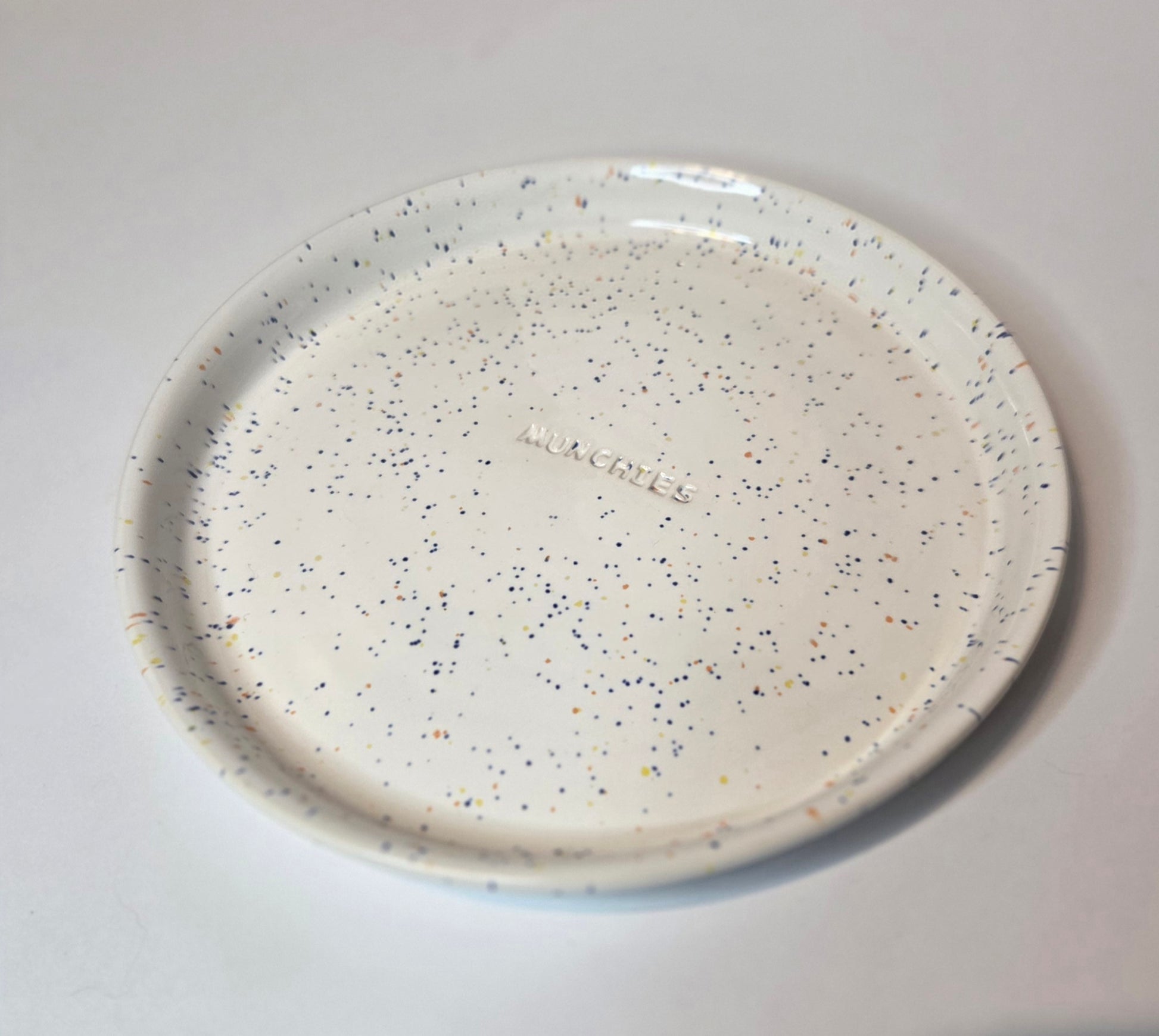 White confetti glazed plate that's the perfect size for a midnight snack. Measures approximately 7" wide.