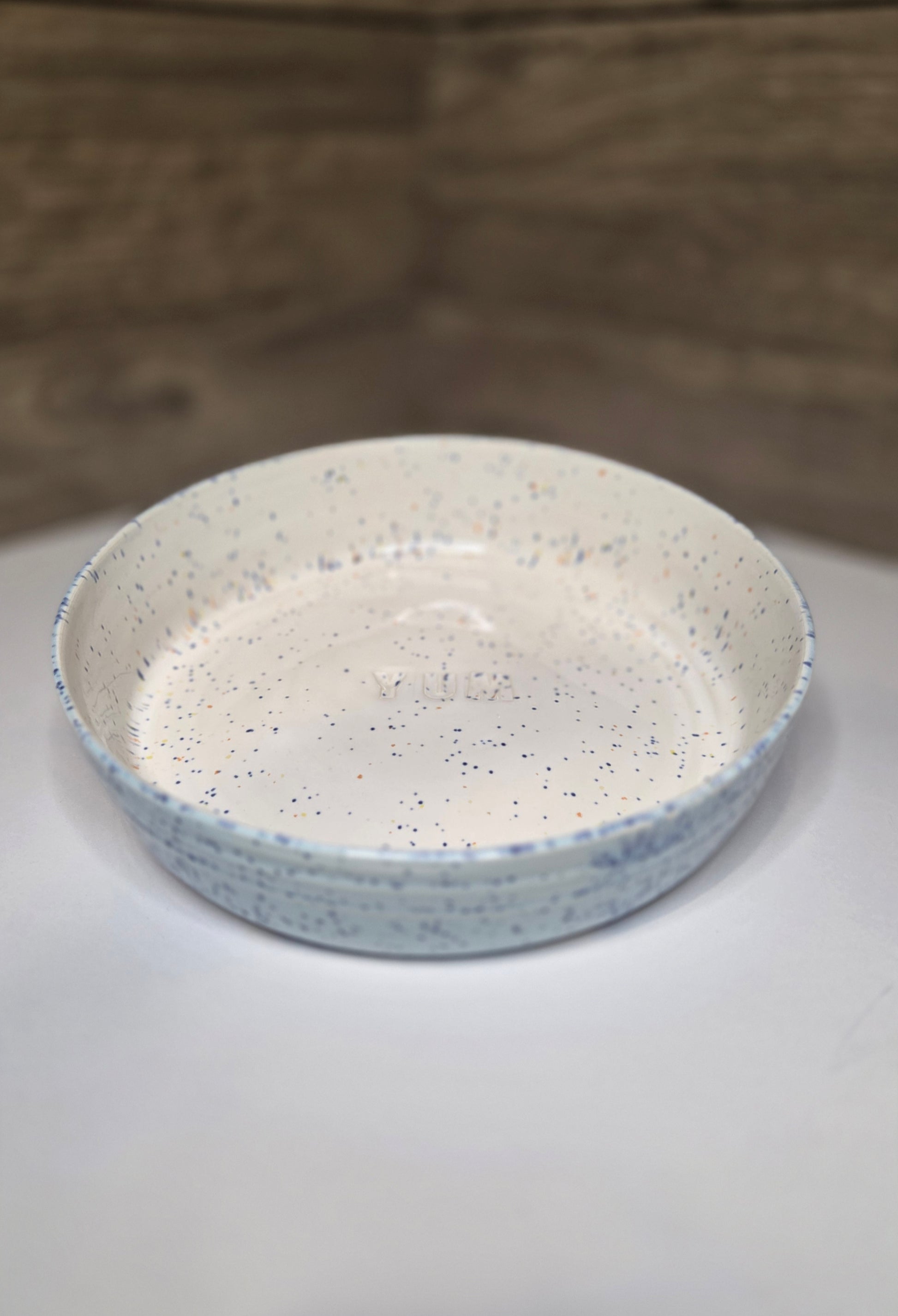 Blue Speckle glaze outside with white speckle glaze coating the inside. Super fun dish with YUM stamped on the inside. Use to hold your favorite munchies while entertaining. Measures 2" tall x 8" diameter.